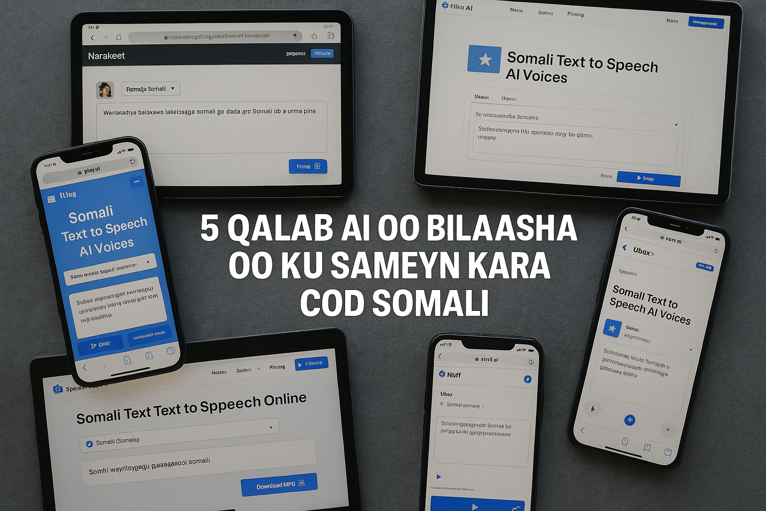 Maqaalkan wuxuu kaa caawinayaa inaad barato 5 Qalab AI Oo Bilaash ah Oo Ku Sameyn Kara Cod Somali (Text‑to‑Speech), kuwaas oo abuuri kara cod Somali ah adiga oo adeegsanaya internet iyo telefoon.